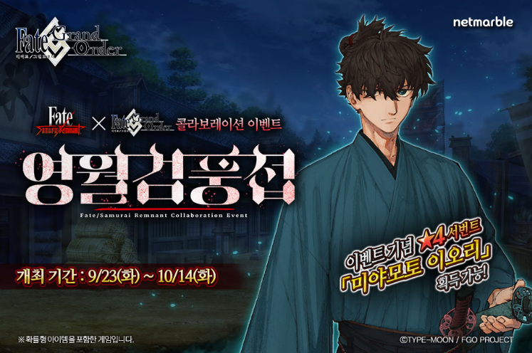 넷마블은 모바일 RPG <페이트/그랜드 오더>에 Fate/Samurai Remnant와의 콜라보레이션 이벤트 '영월검풍첩'을 오는 10월 14일까지 실시한다고 밝혔다.