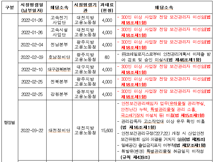 가장 많은 지적을 받은 사안은 산업안전보건법 제18조 제1항에 규정된 ‘300인 이상 사업장 전담 보건관리자 선임’ 의무를 위반한 것으로, 대전지방고용노동청 등 총 7곳에서 위반이 적발돼 2,400만 원의 과태료를 부과받았다.