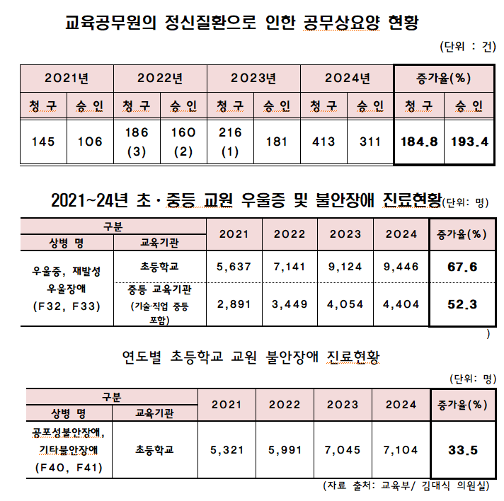 자료에 따르면, 정신질환으로 공무상 요양을 청구한 교원 수는 2021년 145명에서 2024년 413명으로 184.8% 증가했으며, 승인 건수 역시 106명에서 311명으로 193.4% 급증했다.