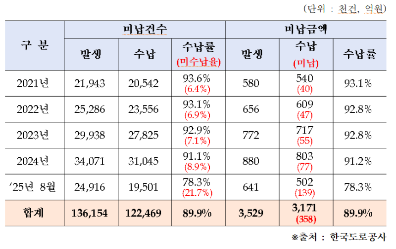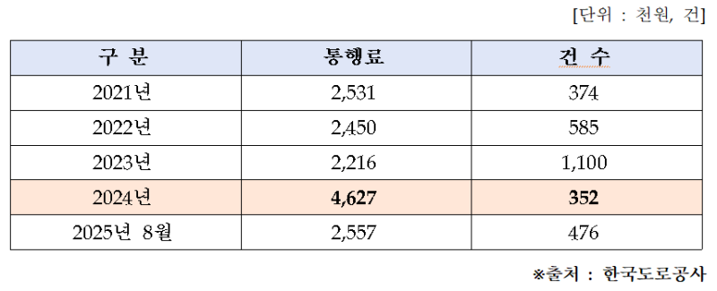 국회 국토교통위원회 소속 정점식 의원(경남 통영시·고성군)이 한국도로공사(이하 ‘도로공사’)로부터 제출받은 '고속도로 하이패스 통행료 미납현황' 자료에 따르면, 2021년 2,194만 건(미수납율 6.4%, 40억 원)이던 미납 발생 건수가 매년 증가해 2024년에는 3,407만 건(미수납율 8.9%, 77억 원)으로 3년 새 55% 증가한 것으로 조사됐다.