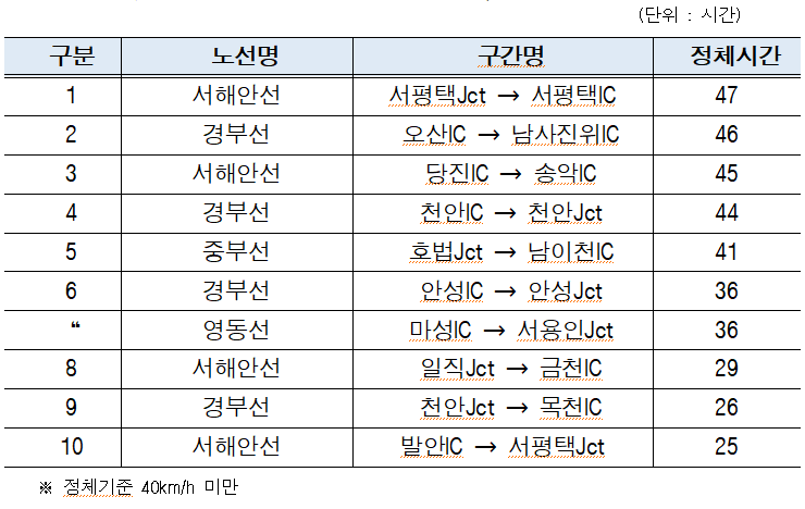 경부선 역시 만성적인 정체 상습구간이 해마다 반복되고 있다. 오산IC~남사진위IC 구간은 ´22년 추석 24시간, ´23년 추석 46시간, ´24년 설 28시간의 정체가 발생하며 최근 3년 연속 상위 정체 구간으로 집계됐다.