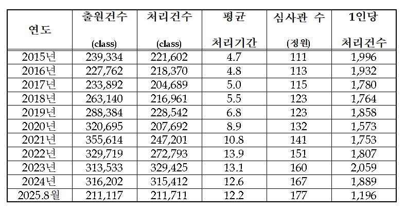 국회 산업통상자원중소벤처기업위원회 소속 김동아 의원(더 서울 서대문갑)이 특허청으로부터 제출받은 ‘연도별 상표심사 처리현황’에 따르면, 최근 3년간(2022~2024년) 상표 심사 처리기간은 평균 13.2개월이 걸렸으며, 심사관 1인당 연간 1,918건을 담당하고 있는 것으로 나타났다.