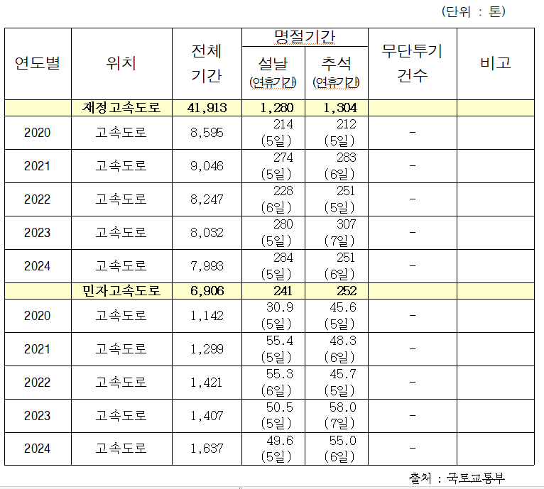 명절 연휴에 발생하는 고속도로 쓰레기 문제는 여전히 심각하다. 최근 5년간 명절 쓰레기를 연휴 일수로 나눠보면, 설날 하루 평균 58.5t, 추석 하루 평균 53.7t으로 집계됐다. 이는 일반 기간 하루 평균 발생량(약 27t)의 두 배를 넘는 수준이다.