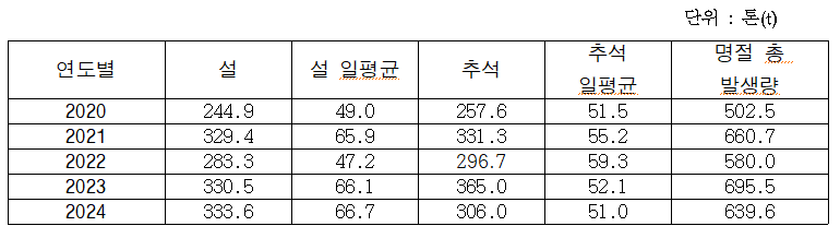 특히 2023년에는 명절 연휴 쓰레기가 총 695.5t으로 최근 5년간 최고치를 기록했으며, 2024년에도 639.6t에 달해 여전히 높은 수준을 유지했다.