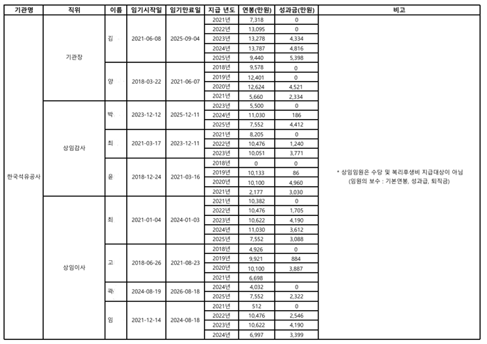 제출 자료에 따르면 석유공사 기관장과 상임이사 김동섭 사장은 2024년 연봉 1억 3,787만 원·성과급 4,816만 원을 수령했고 2025년에도 현재까지 연봉 9,440만 원·성과급 5,398만 원을 받아 갔다.