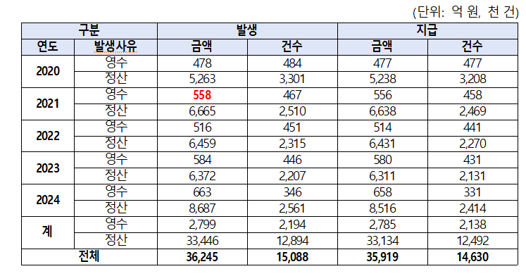 발생사유별로 보면, 영수환급이 2,799억 원, 정산환급이 3조 3,446억 원이다. 환급건수 기준으로는 영수환급이 219만 4천건, 정산환급이 1,289만 4천건이다. 가입자별로는 총 3조 6,245억 원 중 지역가입자가 1조 377억 원, 직장가입자가 2조 5,868억 원이었고, 환급건수 기준으로는 지역가입자가 1,127만 9천건, 직장가입자가 380만 9천건이었다.