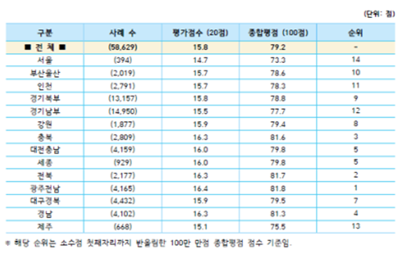 반면 광주·전남(16.4점)이 가장 높은 점수를 받았으며, 이어 전북(16.3점), 충북(16.3점), 경남(16.3점), 대전·충남(16.0점), 세종(16.0점) 순으로 뒤를 이었다. 낮은 순위에는 서울(14.7점), 제주(15.1점), 경기남부(15.5점) 등이 포함됐다.