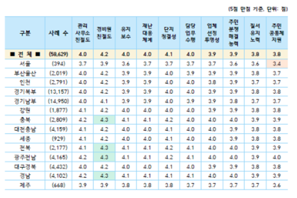 항목별로는 '주민 공동체 지원'이 3.8점으로 가장 낮았고, 반대로 '경비원 친절도'가 4.2점으로 가장 높은 평가를 받았다.