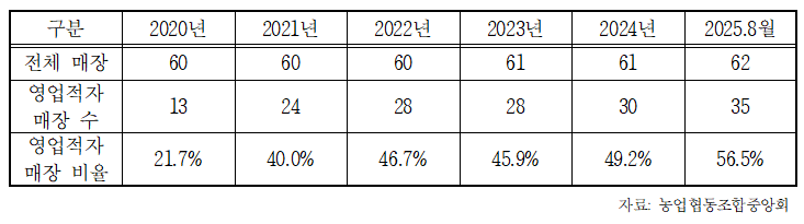㈜농협유통 역시 영업적자와 당기순손실을 기록 중인 것으로 나타났다. ㈜농협유통은 2021년까지 영업이익과 당기순이익을 보였지만 2022년 213억 원의 영업적자를 기록한 후 2023년 283억 원, 2024년 218억 원, 2025년 8월 기준 143억 원의 영업적자를 기록했고, 당기순손실은 2022년 183억 원, 2023년 288억 원, 2024년 352억 원, 2025년 8월 기준 152억 원으로 증가추세를 보이는 것으로 확인됐다.