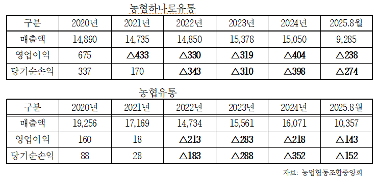 ㈜농협하나로유통은 지난 2020년 675억 원의 영업이익에서 2021년 433억 원의 영업적자로 돌아선 후 2022년 330억 원, 2023년 319억 원, 2024년 404억 원, 2025년 8월 기준 238억 원의 영업적자를 보였으며, 당기순손실도 2022년 343억 원, 2023년 310억 원, 2024년 398억 원, 2025년 8월 현재 274억 원인 것으로 조사됐다.