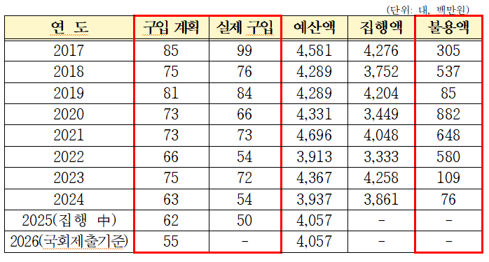 외교부는 노후 차량 교체 및 신규 수요를 충당한다는 이유로 매년 약 40억원 규모의 ‘재외공관 차량 구입 및 교체’ 예산을 편성 받고 있지만, 당초 차량 구입 계획과 실제 구입 차량 대수 간 차이가 매년 발생하고, 불용액도 꾸준히 발생하고 있는 것으로 파악됐다.