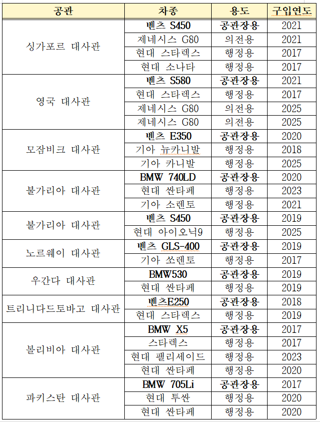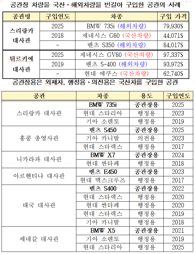 일부 재외공관은 국산차와 외제차를 번갈아가며 구입하는 사례도 드러났다. 스리랑카 대사관은 ‘벤츠→현대→BMW’로, 튀르키예 대사관은 ‘현대→벤츠→현대’로 차량을 교체해왔다.