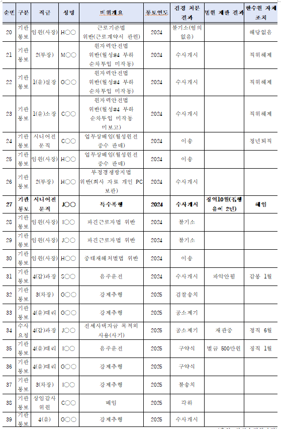 특히 지난해에는 임직원 해임 조치가 3건에 달했으며, 특수폭행, 시간외근무수당 부정 수령(사기, 사전자기록위작), 해외근무자 복무규정 위반(사전자기록위작)으로 인한 것이었다.