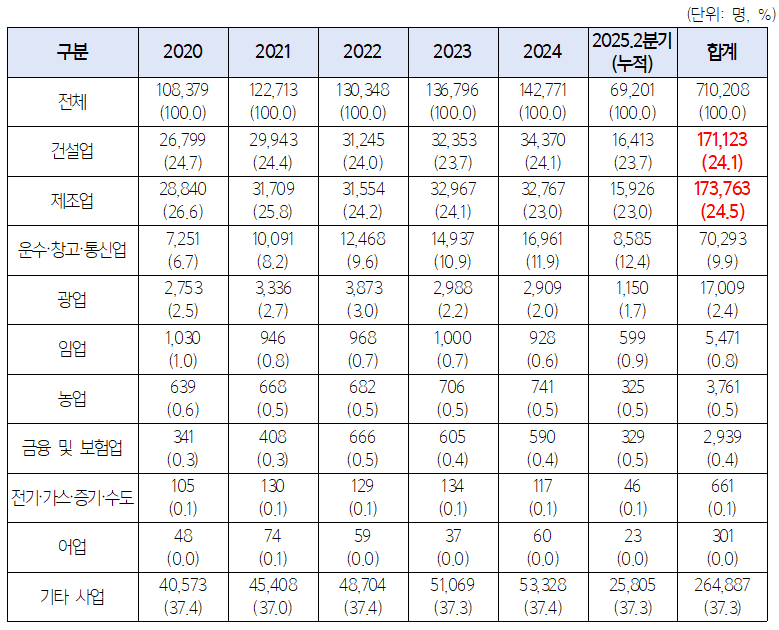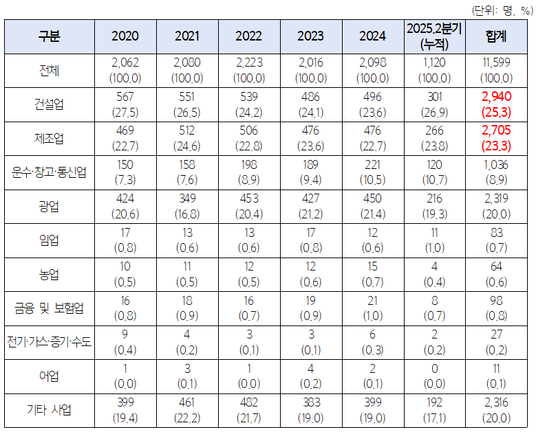 건설업 사망자 중 75%(2,214명), 제조업 사망자 중 68%(1,836명)는 50인 미만 사업장 소속이었다. 산재 예방을 위해서는 50인 미만 건설업·제조업 사업장에 대한 지원이 시급하다는 의미다.