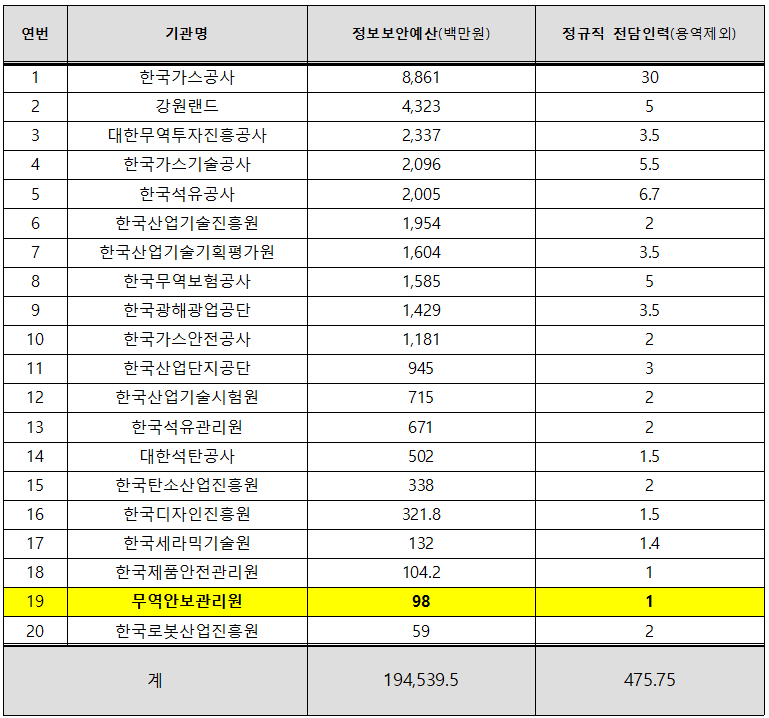 반면 해킹 시도 탐지 건수가 유사한 한국가스공사(211건)의 경우 정보보안 전담 인력만 30명, 예산은 연 88억원 이상이다.