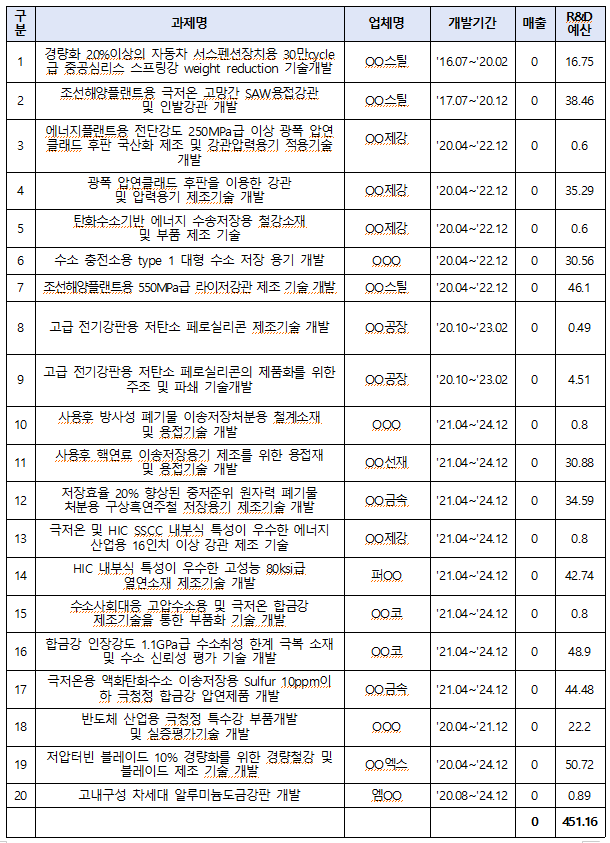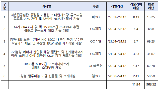 ‘조선해양플랜트용 고망간강관’,‘라이저 강관 제조기술’도 각각 38억과 46억원의 예산을 들어 사업을 진행했지만, 신뢰성과 안정성 미확보로 발주처 채택조차 되지 못했다.