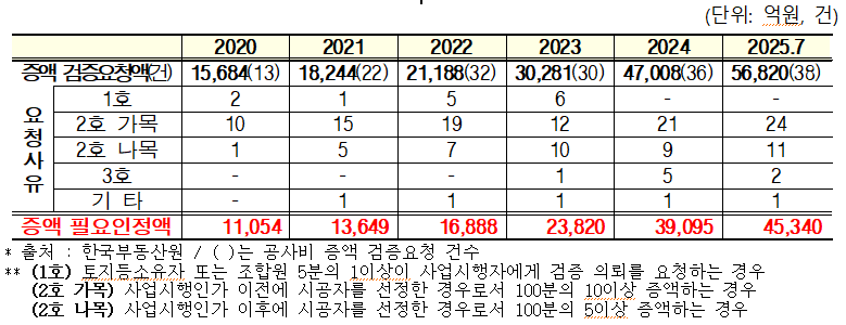 안태준 의원(경기 광주을, 국토교통위원회)이 한국부동산원에서 제출받은 자료에 따르면, 최근 5년간(’20년~‘25.7월) 공사비 증액 검증요청액은 ’20년 1조 5,684억원(13건)에서 ‘25년 7월 5조 6,820억원(38건)으로 4조 1,136억원(362%) 증가했다.