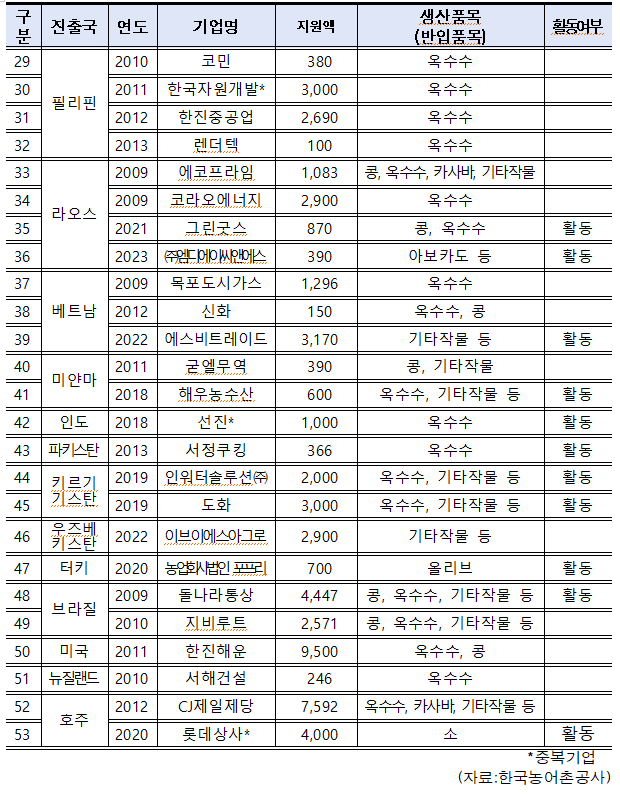 한진중공업은 2012년 26.9억원을 받고 필리핀에서 옥수수 재배를 추진했으나 곡물 반입 실적 없이 폐업했고 CJ제일제당은 2012년 75.9억원을 받아 호주 진출을 선언했지만 한 번도 자원 반입 없이 철수했다.