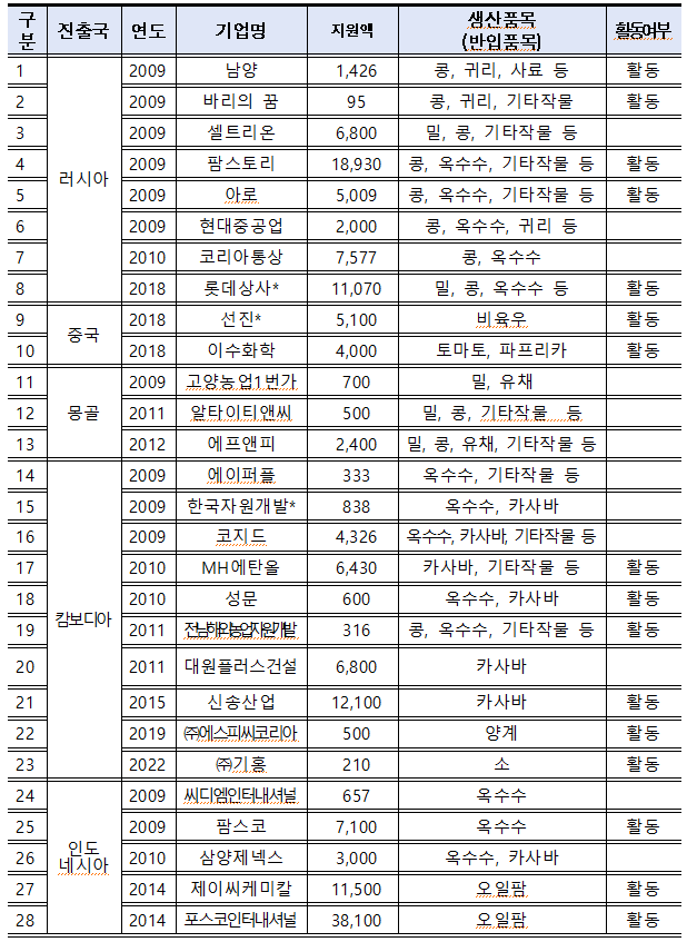 셀트리온은 2010년부터 러시아에서 밀·콩 재배를 이유로 68억원을 지원받았으나 단 한 차례 반입도 없이 2020년 사업을 접었다. 현대중공업은 2016년 20억원을 지원받아 2017년 러시아에서 콩, 옥수수 등 156톤 반입 후 실적 없이 사업을 종료했다.