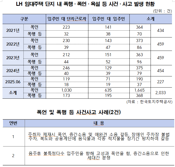 특히, 전체 사건‧사고 중 60%에 육박하는 1,203건이 입주민과 단지 근로자 간에 발생한 것으로 나타났다. 입주민 간의 다툼보다 단지 근로자와의 갈등에서 더 많은 사건이 발생하고 있다.