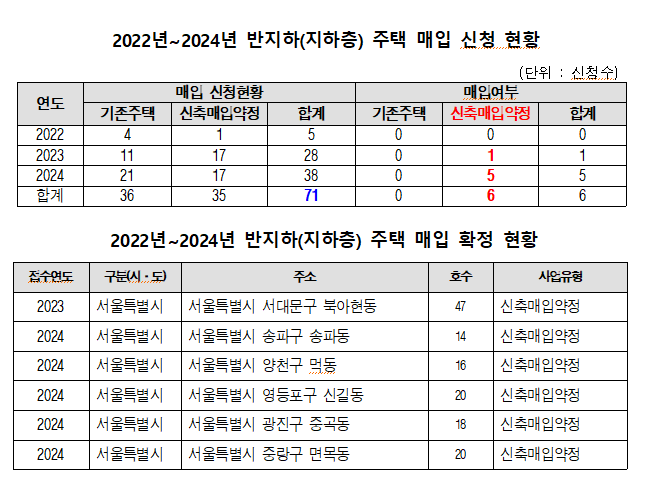 국회 국토교통위원회 소속 더불어민주당 송기헌 국회의원(강원 원주을·3선)이 LH로부터 제출받은 ‘반지하(지하층) 주택 매입 신청 현황’ 자료에 따르면 2022년부터 2024년까지 3년간 반지하(지하층) 주택 매입을 신청한 건수는 총 71건(735세대)이였으나, 실제로 매입이 완료된 것은 단 6건(135세대)에 불과했다.