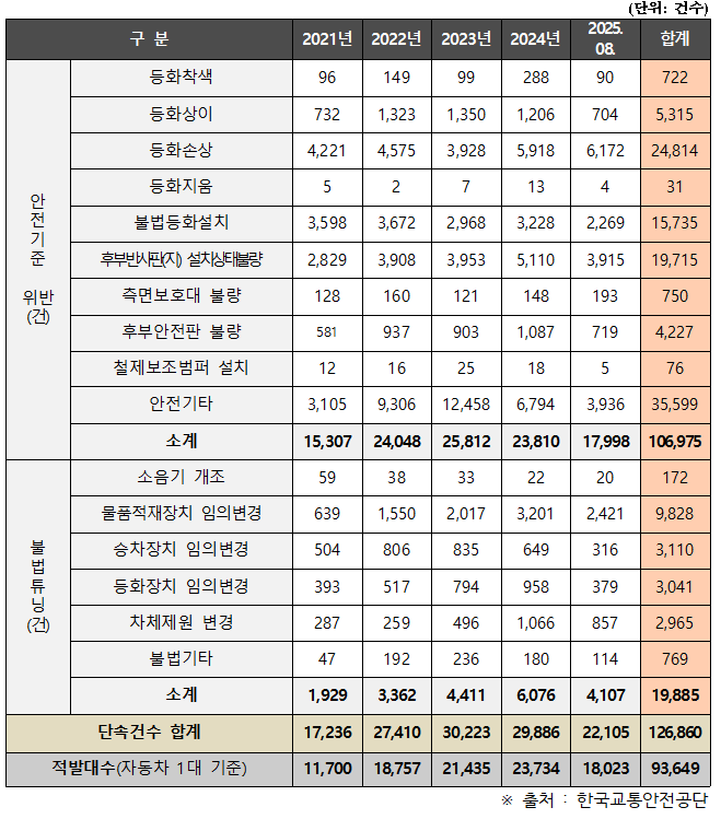 특히 불법 튜닝은 ▲2021년 1,929건 ▲2022년 3,362건 ▲2023년 4,411건 ▲2024년 6,076건이 적발되어 4년 새 3배 넘게 증가한 것으로 집계됐다.