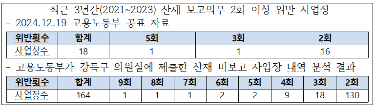 3년간 산재 발생 보고의무 2회 이상 위반 사업장 18곳 공표, 실제로는 164곳