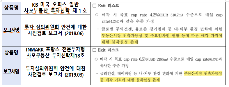 더욱이 공제회는 투자결정 단계에서 이미 이러한 자금회수 리스크를 인지했음에도 투자를 강행한 것으로 나타났다. 공제회의 리스크관리보고서에 따르면, 두 상품 모두 “부동산시장 위축가능성 등으로 매각 가격에 대한 불확실성이 존재”한다는 우려가 있었으며, 투자심의위원회에서도 관련 지적이 있었다.