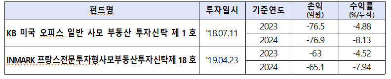 하지만 두 건의 투자 모두 최근 2년간 연속 손실을 기록했다. 프랑스 소재 오피스빌딩에서는 △2023년 63억 원, △2024년 65억 원의 평가손실이 발생했으며, 미국 소재 오피스빌딩에서도 △2023년 76억 원, △2024년 77억 원의 평가손실이 이어졌다.
