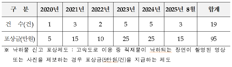 포상을 받으려면 적재물이 차량에서 떨어지는 순간을 명확히 촬영해 제보해야 하는데, 시속 100km로 달리는 도로 위에서 이를 포착하기란 사실상 불가능에 가깝다. 게다가 포상금도 5만 원에 불과해 신고를 유도하기에는 실효성이 떨어진다는 지적이다.