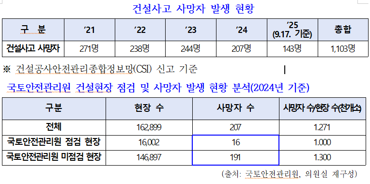 이건태 국회의원(경기 부천병, 더불어민주당)은 건설공사 안전관리 종합 정보망(CSI) 신고 기준, 최근 4년 9개월간(2021~2025.9) 건설사고 사망자가 1,103명으로 나타났다고 밝혔다.
