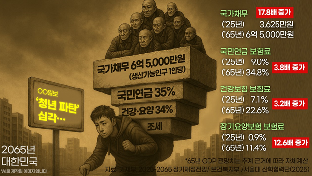 여기에 국민연금 지급을 위해서는 월급의 약 35%를 국민연금 보험료로 납부해야 하고, 건강보험·장기요양보험료는 각각 총 월급의 22.6%, 11.4%를 내야 한다. 이 세 가지만 합쳐도 월급의 70%가 보험료로 빠져나가는 셈”이라고 강조했다.