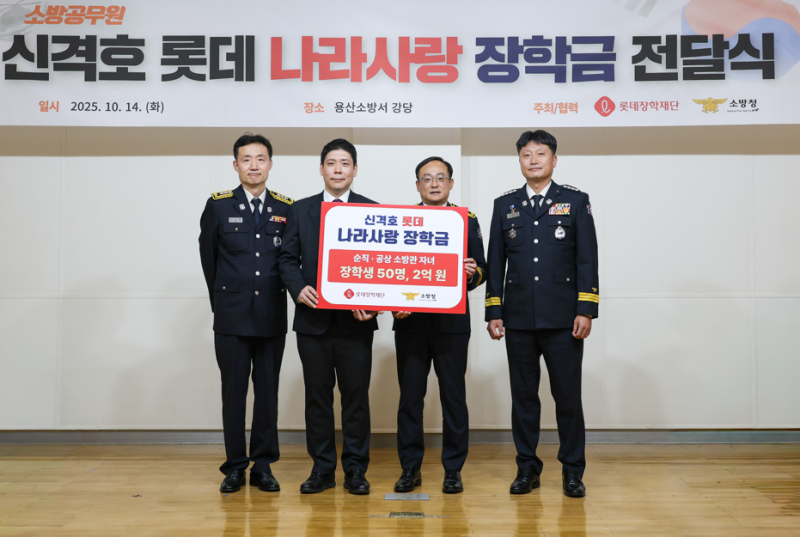 롯데장학재단(이사장 장혜선)이 지난 14일(화) 서울 용산소방서 강당에서 '신격호 롯데 나라사랑 장학금 전달식'을 열고, 국가를 위해 공무를 수행하던 중 순직하거나 부상당한 소방관 자녀 50명에 총 2억 원의 장학금을 지원했다.