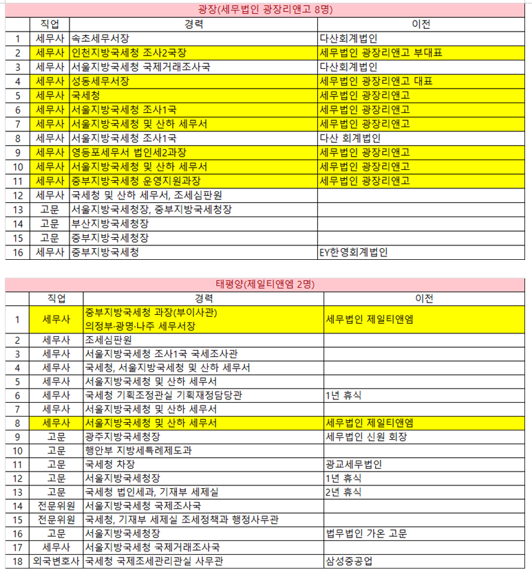 김앤장 법률사무소 12명, 법무법인 광장 8명, 태평양 2명, 화우 1명으로, 모두 국세청 퇴직 이후 로펌과 관련된 세무법인에서 3년가량 근무한 뒤 해당 로펌으로 자리를 옮긴 사례들이다.