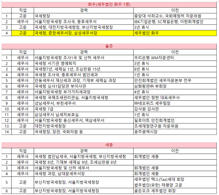 세무법인 광장리앤고는 전체 세무사 9명 중 5명이, 세무법인 화우는 12명 중 6명이 국세청 출신으로, 국세청 전관들이 밀집한 구조를 보였다.