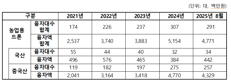 또한 농업용 드론 구입융자 200억 원 중 중국산 드론 1,030대에 177억 원(88.2%)이 투입된 것으로 조사됐다. 국산 드론은 205대 약 24억원에 불과했다.