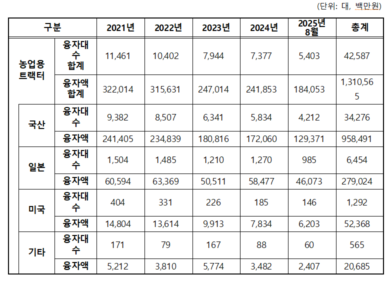 국회 농림축산식품해양수산위원장 어기구 의원(더불어민주당, 충남 당진시)은 16일 농림축산식품부로부터 제출받은 자료에 따르면, 2021년부터 올해 8월까지 트랙터 구입 융자사업을 운영하며 총 1조 3105억 원을 지원했으며 이 가운데 4분의 1 이상인 3520억 원이 외국산 트랙터에 지원됐다.