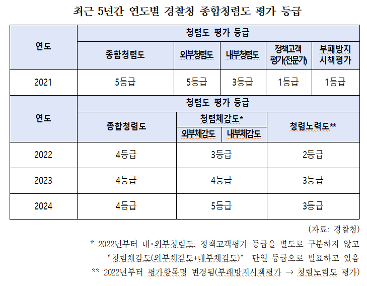 경찰청은 매년 실시되는 국민권익위원회 청렴도 평가에서 2022년부터 2024년까지 종합청렴도 4등급을 기록했고, 특히 청렴노력도는 2021년 1등급에서 2024년 3등급으로 곤두박질쳤다. 경찰청이 사실상 내부 비위 자정작용을 포기한 것 아니냐는 지적이 나오는 이유다.