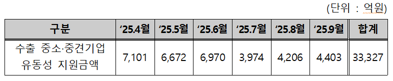 무보의 美 관세 대응 긴급지원 TF가 구성된 지난 4월부터 월별 지원 금액은 ▲4월 7,101억 원, ▲5월 6,672억 원, ▲6월 6,970억 원, ▲7월 3,974억 원, ▲8월 4,206억 원, 9월 4,403억 원으로 총 3조 3,327억 원이 투입됐다.