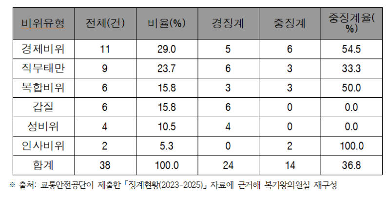 국회 국토교통위원회 소속 복기왕 의원(더불어민주당, 아산갑)이 한국교통안전공단의 최근 「징계현황」을 분석한 결과가 이를 증명한다. 총 38건의 징계 사례 중 경제비위가 11건(29.0%)으로 가장 많았고, 직무태만 9건(23.7%), 복합비위와 갑질이 각 6건(15.8%), 성비위 4건(10.5%), 인사비위 2건(5.3%) 순이었다.