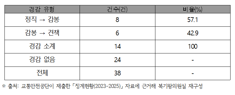 문제는 징계의 실효성이다. 전체 38건 중 14건(36.8%)에서 징계가 경감됐다. 정직에서 감봉으로 8건, 감봉에서 견책으로 6건이 낮아졌다. 징계위원회가 내린 처분보다 한 단계 가벼운 징계가 최종 확정된 셈이다. 중대한 비위에도 '봐주기식 징계'가 반복되고 있다는 비판이 나올 수밖에 없다.