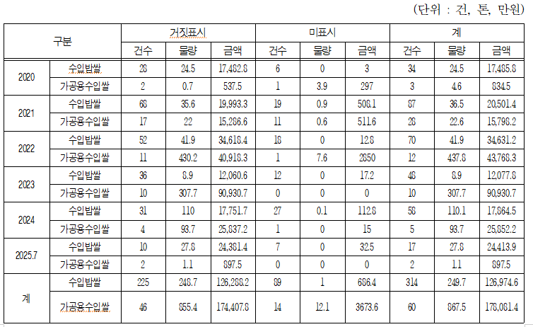 국회 농림축산식품해양수산위원회 윤준병 의원(더불어민주당, 전북특별자치도 정읍시·고창군)이 농림축산식품부로부터 제출받은 자료를 분석한 결과, 2020년부터 올해 7월까지 총 374건, 1,117.2톤의 수입쌀(수입밥쌀·가공용수입쌀)이 원산지를 속여 시중에 부정 유통된 것으로 드러났다.