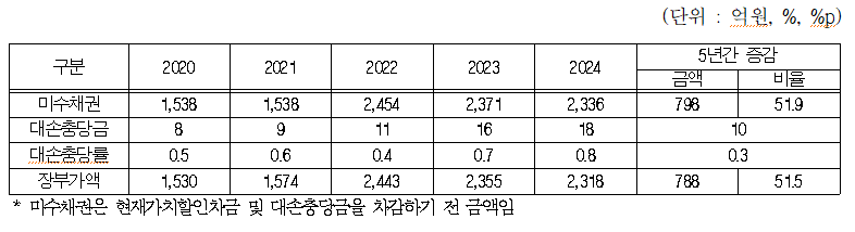 미수금 2,336억 원 대비 대손충당률 0.8%에 불과, 사후관리 강화 및 적정 대손충당금 설정 등 대책 필요