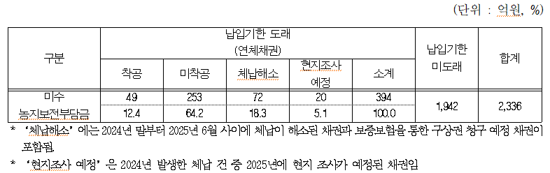 납입기간 도래 연체채권 394억원 중 64.2%(253억원) 농지전용 후 착공도 안돼, 분할납부제도 부실
