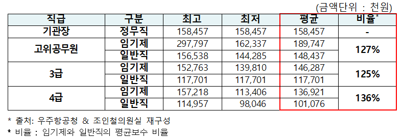 임기제 인력은 우주청의 핵심 기술개발과 연구사업 대부분을 담당하고 있으며, 1급 본부장은 최소 대통령급, 2급은 차관급 수준의 보수를 받는 등 인사·보수 전반에서 폭넓은 특례가 적용되고 있다.