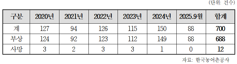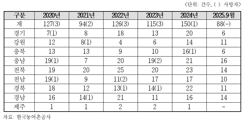 지역별로는 전북 지역이 121건으로 안전사고가 가장 많이 발생했으며, 이어 충남 105건, 경남 93건, 경북 92건, 전남 86건, 경기 73건, 충북 67건, 강원 56건, 제주 7건 등으로 나타났다.