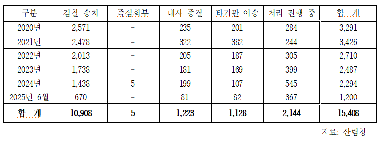 산림 내 불법행위에 따른 5년간의 조치현황은 검찰 송치가 전체(15,408건)의 70.8%인 10,908건으로 가장 많았고, 내사 종결 1,223건, 타기관 이송 1,128건, 즉심회부 5건으로 나타났으며, 처리 진행 중인 사건도 2,144건으로 확인됐다.