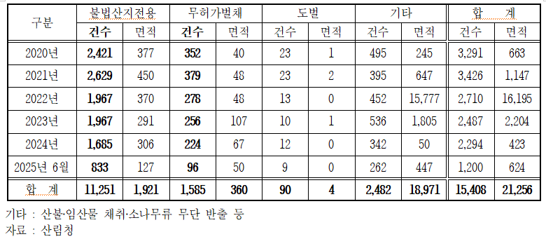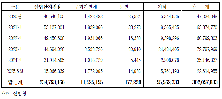 산림 내 불법행위에 따른 피해액은 5년간 총 3,020억 5,788만 원에 달했으며, 불법산지전용에 따른 피해액이 2,347억 9,316만 원으로 많았고, 기타(산불‧임산물 채취‧소나무류 무단 반출 등) 555억 6,233만 원, 무허가벌채 115억 2,515만 원, 도벌 1억 7,722만 원 등의 순으로 확인됐다.