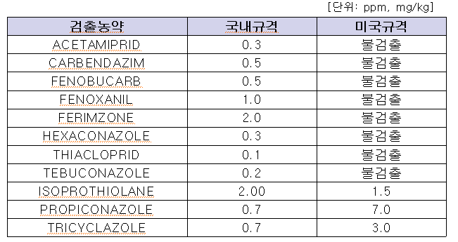 국내 쌀에 잔류 기준이 설정된 농약 175개 중에 미국에서 불검출 기준을 적용하는 농약은 총 107에 달한다.
