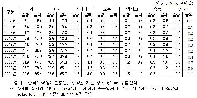 2015년부터 2024년까지 즉석밥 수출실적은 중량 기준으로 연평균 34.2%, 금액 기준으로는 33.4%씩 증가했다. 지난 10년 동안 규모는 2,100톤에서 2만 9,600톤으로 무려 1309.5% 증가했고 수출금액은 640만 달러에서 8,540만 달러로 1234.4% 증가했다.